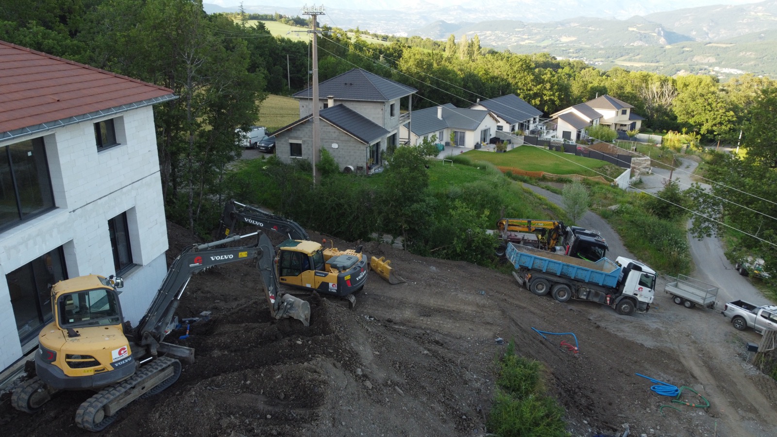 Ce chantier de terrassement en milieu résidentiel illustre la préparation d’un terrain en pente pour l’aménagement des abords d’une villa neuve.